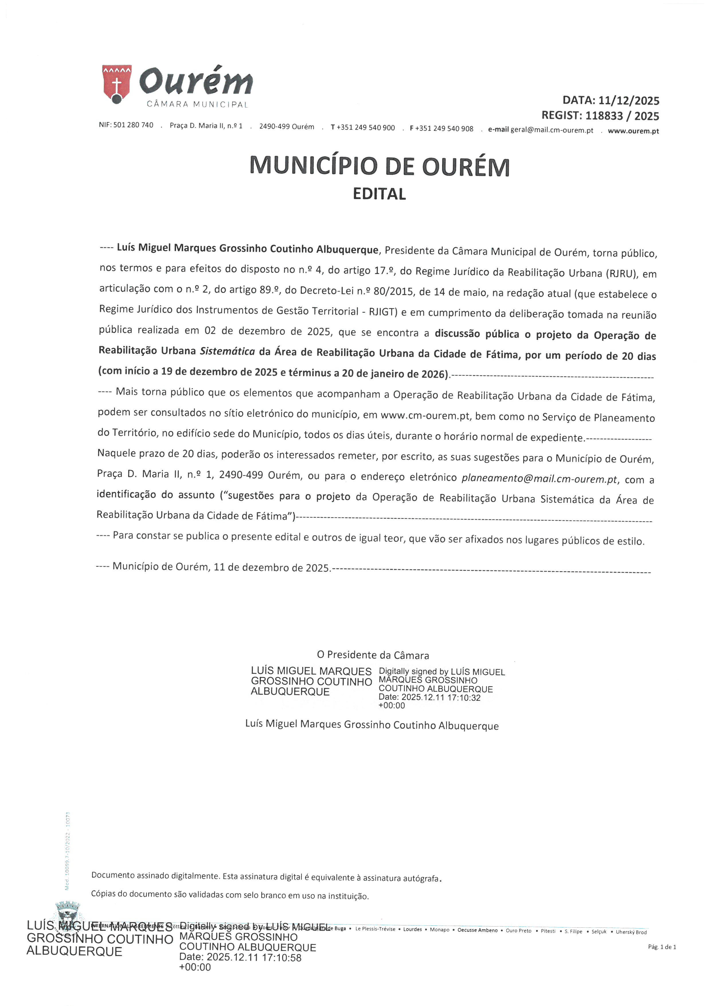 Edital da Câmara Municipal de Ourém sobre o Projeto da Operação de Reabilitação Urbana Sistemática da Área de Reabilitação Urbana da Cidade de Fátima